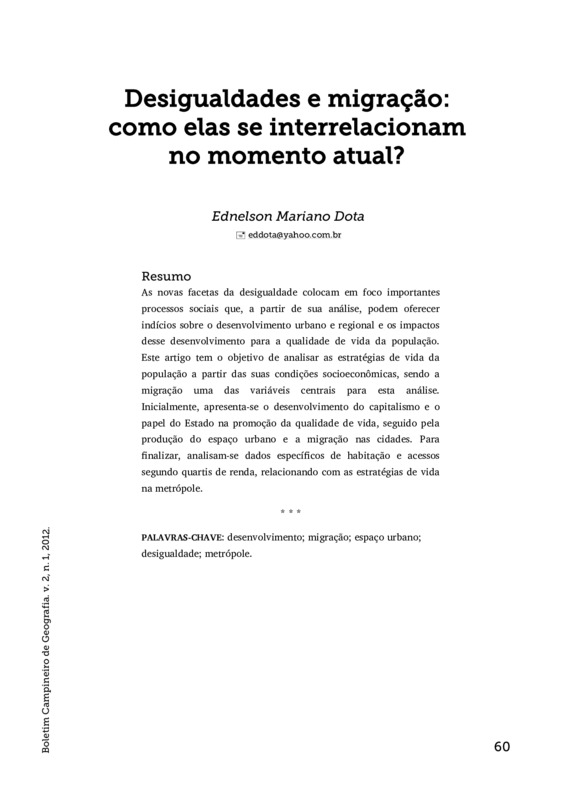 As novas facetas da desigualdade colocam em foco importantes processos sociais que, a partir de sua análise, podem oferecer indícios sobre o desenvolvimento urbano e regional e os impactos desse desenvolvimento para a qualidade de vida da população. Este artigo tem o objetivo de analisar as estratégias de vida da população a partir das suas condições socioeconômicas, sendo a migração uma das variáveis centrais para esta análise. Inicialmente, apresenta-se o desenvolvimento do capitalismo e o papel do Estado na promoção da qualidade de vida, seguido pela produção do espaço urbano e a migração nas cidades. Para finalizar, analisam-se dados específicos de habitação e acessos segundo quartis de renda, relacionando com as estratégias de vida na metrópole.