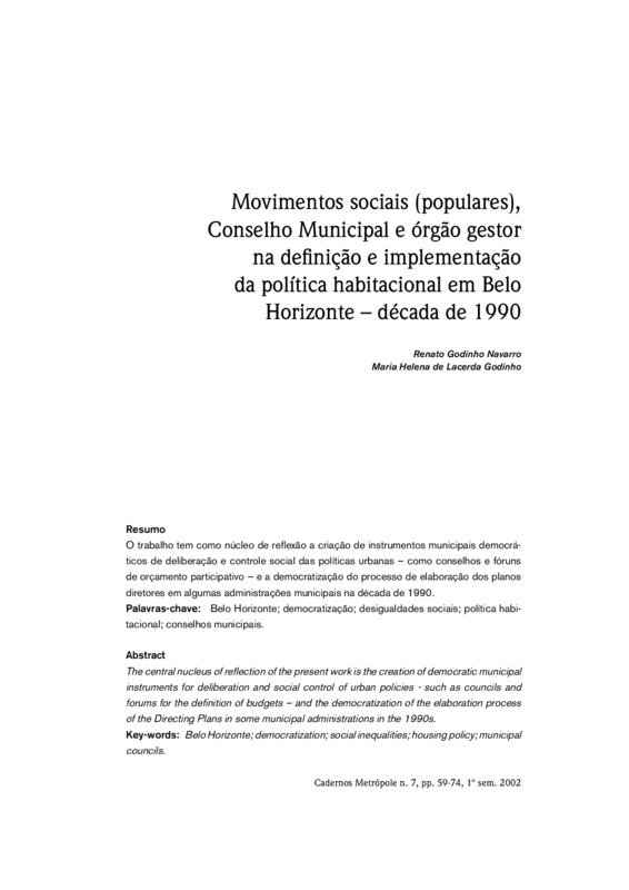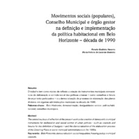 Movimentos sociais (populares), Conselho Municipal e órgão gestor na defi nição e implementação da política habitacional em Belo Horizonte – década de 1990