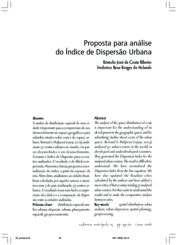 A análise da distribuição espacial de uma cidade é importante para a compreensão do seu desenvolvimento no espaço geográfico e para subsidiar estudos sobre custos do espaço urbano. Bertaud e Malpezzi (1999; 2003) analisaram 50 centros urbanos no mundo, em países desenvolvidos e em desenvolvimento. Geraram o Índice de Dispersão para os centros analisados. O resultado é de difícil compreensão. Para maior clareza, propomos a normalização do índice a partir da equação da reta. Além disto, atualizamos as cidades brasileiras calculadas por aqueles autores e inserimos mais 7 do país, totalizando 57 centros urbanos. O resultado torna mais fácil a compreensão dos dados e a comparação da dispersão entre as cidades analisadas.
