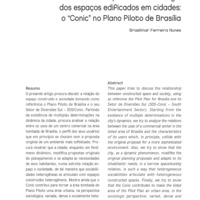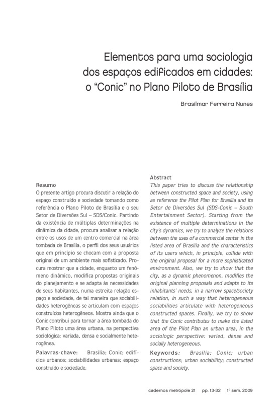 O presente artigo procura discutir a relação do espaço construído e sociedade tomando como referência o Plano Piloto de Brasília e o seu Setor de Diversões Sul – SDS/Conic. Partindo da existência de múltiplas determinações na dinâmica da cidade, procura analisar a relação entre os usos de um centro comercial na área tombada de Brasília, o perfil dos seus usuários que em princípio se chocam com a proposta original de um ambiente mais sofisticado. Procura mostrar que a cidade, enquanto um fenômeno dinâmico, modifica propostas originais do planejamento e se adapta às necessidades de seus habitantes, numa estreita relação espaço e sociedade, de tal maneira que sociabilidades heterogêneas se articulam com espaços construídos heterogêneos. Mostra ainda que o Conic contribui para tornar a área tombada do Plano Piloto uma área urbana, na perspectiva sociológica: variada, densa e socialmente heterogênea.Palavras-cha