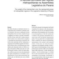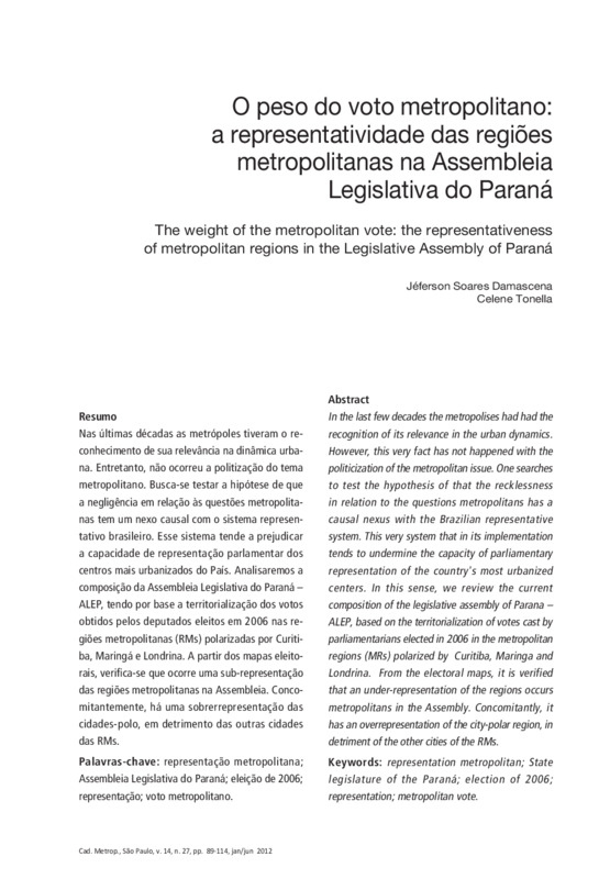 Nas últimas décadas as metrópoles tiveram o reconhecimento de sua relevância na dinâmica urbana. Entretanto, não ocorreu a politização do tema metropolitano. Busca-se testar a hipótese de que a negligência em relação às questões metropolitanas tem um nexo causal com o sistema representativo brasileiro. Esse sistema tende a prejudicar a capacidade de representação parlamentar dos centros mais urbanizados do País. Analisaremos a composição da Assembleia Legislativa do Paraná – ALEP, tendo por base a territorialização dos votos obtidos pelos deputados eleitos em 2006 nas regiões metropolitanas (RMs) polarizadas por Curitiba, Maringá e Londrina. A partir dos mapas eleitorais, verifica-se que ocorre uma sub-representação das regiões metropolitanas na Assembleia. Concomitantemente, há uma sobrerrepresentação das cidades-polo, em detrimento das outras cidades das RMs.