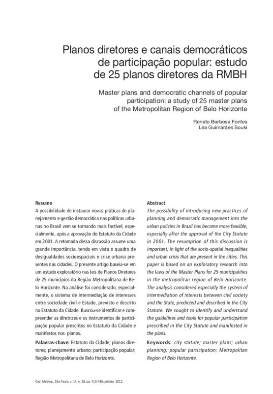 A possibilidade de instaurar novas práticas de planejamento e gestão democrática nas políticas urbanas no Brasil vem se tornando mais factível, especialmente, após a aprovação do Estatuto da Cidade em 2001. A retomada dessa discussão assume uma grande importância, tendo em vista o quadro de desigualdades socioespaciais e crise urbana presentes nas cidades. O presente artigo baseia-se em um estudo exploratório nas leis de Planos Diretores de 25 municípios da Região Metropolitana de Belo Horizonte. Na análise foi considerado, especialmente, o sistema de intermediação de interesses entre sociedade civil e Estado, previsto e descrito no Estatuto da Cidade. Buscou-se identificar e compreender as diretrizes e os instrumentos de participação popular prescritos no Estatuto da Cidade e manifestos nos planos.
