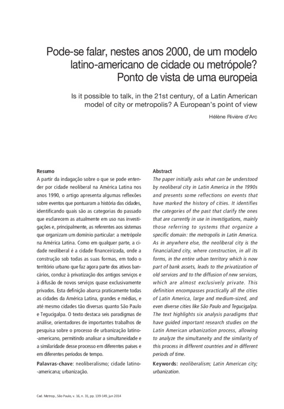 A partir da indagação sobre o que se pode entender por cidade neoliberal na América Latina nos anos 1990, o artigo apresenta algumas reflexões sobre eventos que pontuaram a história das cidades, identificando quais são as categorias do passado que esclarecem as atualmente em uso nas investigações e, principalmente, as referentes aos sistemas que organizam um domínio particular: a metrópole na América Latina. Como em qualquer parte, a cidade neoliberal é a cidade financeirizada, onde a construção sob todas as suas formas, em todo o território urbano que faz agora parte dos ativos bancários, conduz à privatização dos antigos serviços e à difusão de novos serviços quase exclusivamente privados. Esta definição abarca praticamente todas as cidades da América Latina, grandes e médias, e até mesmo cidades tão diversas quanto São Paulo e Tegucigalpa. O texto destaca seis paradigmas de análise, orientadores de importantes trabalhos de pesquisa sobre o processo de urbanização latino-americano, permitindo analisar a simultaneidade e a similaridade desse processo em diferentes países e em diferentes períodos de tempo.