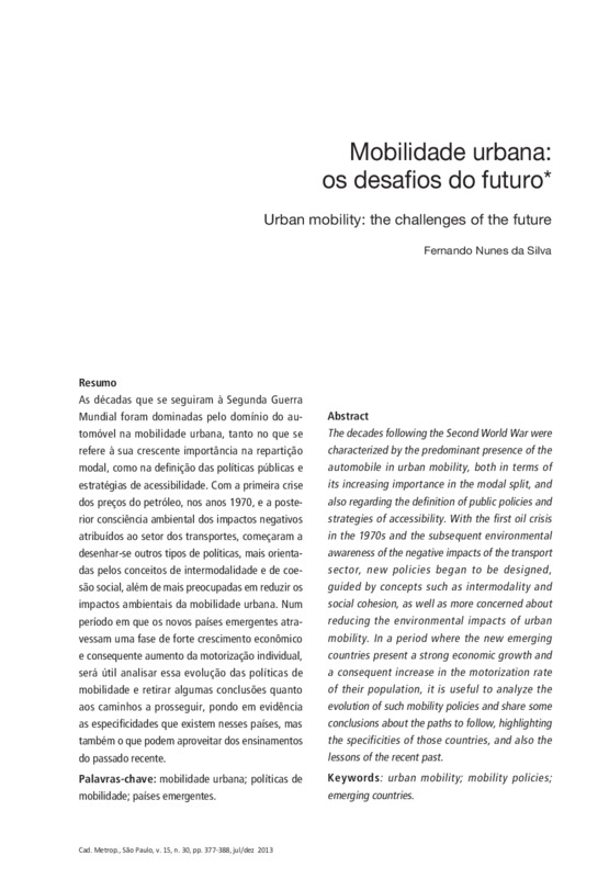 As décadas que se seguiram à Segunda Guerra Mundial foram dominadas pelo domínio do automóvel na mobilidade urbana, tanto no que se refere à sua crescente importância na repartição modal, como na definição das políticas públicas e estratégias de acessibilidade. Com a primeira crise dos preços do petróleo, nos anos 1970, e a posterior consciência ambiental dos impactos negativos atribuídos ao setor dos transportes, começaram a desenhar-se outros tipos de políticas, mais orientadas pelos conceitos de intermodalidade e de coesão social, além de mais preocupadas em reduzir os impactos ambientais da mobilidade urbana. Num período em que os novos países emergentes atravessam uma fase de forte crescimento econômico e consequente aumento da motorização individual,será útil analisar essa evolução das políticas de mobilidade e retirar algumas conclusões quanto aos caminhos a prosseguir, pondo em evidência as especificidades que existem nesses países, mas também o que podem aproveitar dos ensinamentos do passado recente.