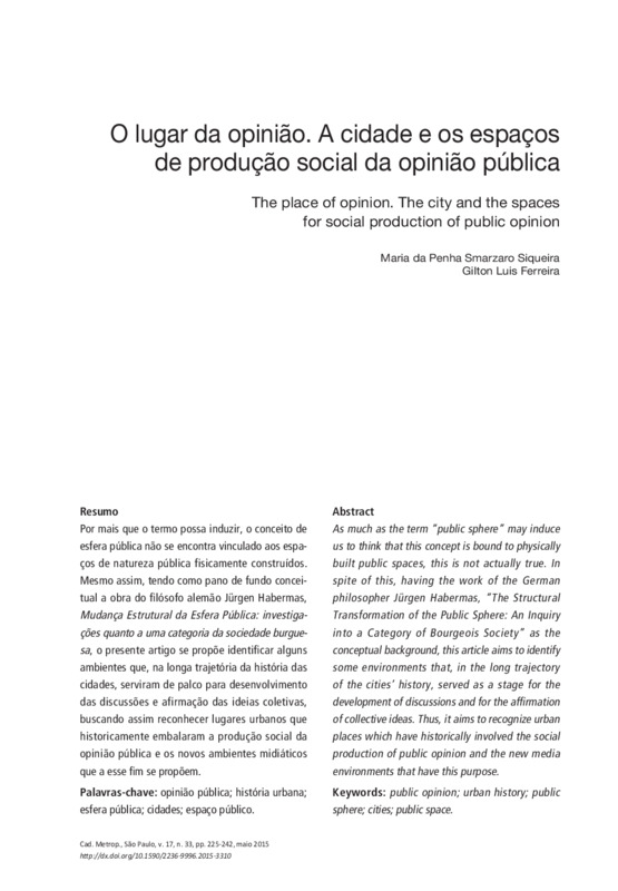 Por mais que o termo possa induzir, o conceito de esfera pública não se encontra vinculado aos espaços de natureza pública fisicamente construídos, mesmo assim, tendo como pano de fundo conceitual a obra do filósofo alemão Jürgen Habermas, Mudança Estrutural da Esfera Pública: investigações quanto a uma categoria da sociedade burguesa, o presente artigo se propõe identificar alguns ambientes que, na longa trajetória da história das cidades, serviram de palco para desenvolvimento das discussões e afirmação das ideias coletivas, buscando assim reconhecer lugares urbanos que historicamente embalaram a produção social da opinião pública e os novos ambientes midiáticos que a este fim se propõem.