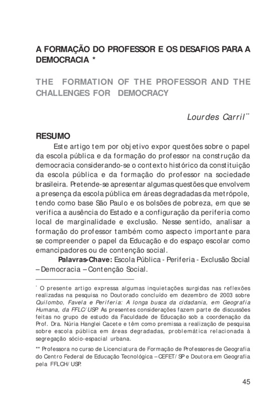 Este artigo tem por objetivo expor questões sobre o papel da escola pública e da formação do professor na construção da democracia considerando-se o contexto histórico da constituição da escola pública e da formação do professor na sociedade brasileira. Pretende-se apresentar algumas questões que envolvem a presença da escola pública em áreas degradadas da metrópole, tendo como base São Paulo e os bolsões de pobreza, em que se verifica a ausência do Estado e a configuração da periferia como local de marginalidade e exclusão. Nesse sentido, analisar a formação do professor também como aspecto importante para se compreender o papel da Educação e do espaço escolar como emancipadores ou de contenção social.