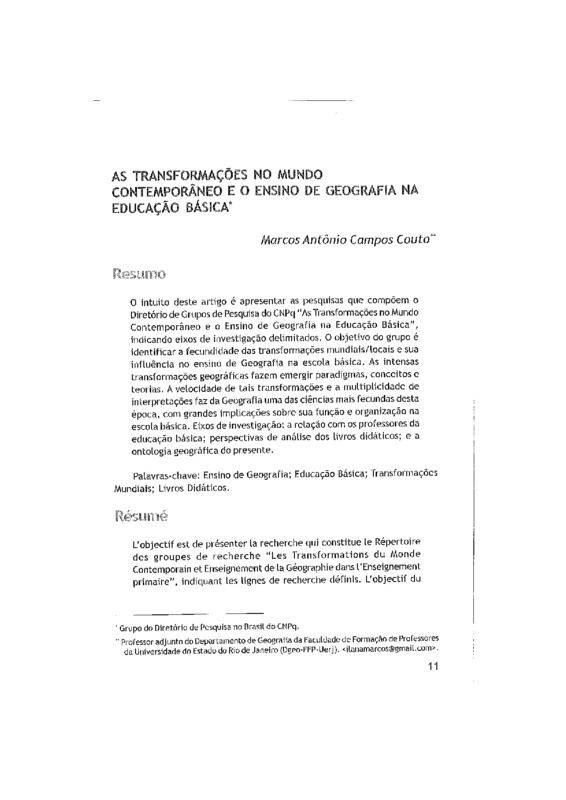 O intuito deste artigo é apresentar as pesquisas que compõem o Diretório de Grupos de Pesquisa do CNPq “As Transformações no Mundo Contemporâneo e o Ensino de Geografia na Educação Básica”, indicando eixos de investigação delimitados. O objetivo do grupo é identificar a fecundidade das transformações mundiais / locais e sua influência no ensino de Geografia na escola básica. As intensas transformações geográficas fazem emergir paradigmas, conceitos e teorias. A velocidade de tais transformações e a multiplicidade de interpretações faz da Geografia uma das ciências mais fecundas desta época, com grandes implicações sobre sua função e organização na escola básica. Eixos de investigação: a relação com os professores da educação básica; perspectivas de análise dos livros didáticos; e a ontologia geográfica do presente.