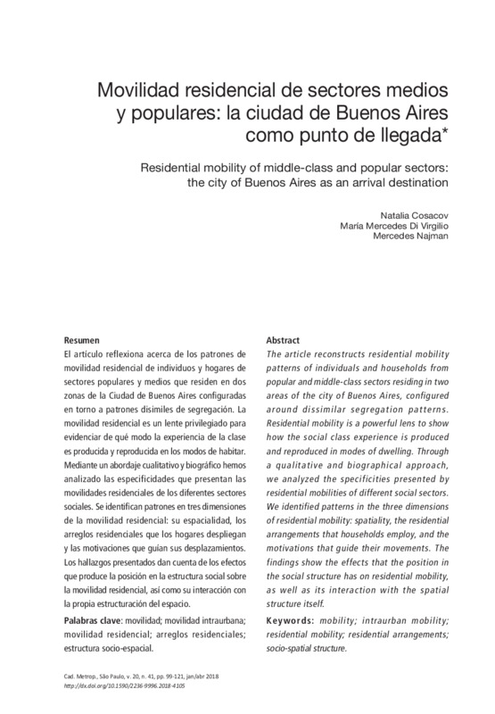 El artículo reflexiona acerca de los patrones de movilidad residencial de individuos y hogares de sectores populares y medios que residen en dos zonas de la Ciudad de Buenos Aires configuradas en torno a patrones disimiles de segregación. La movilidad residencial es un lente privilegiado para evidenciar de qué modo la experiencia de la clase es producida y reproducida en los modos de habitar. Mediante un abordaje cualitativo y biográfico hemos analizado las especificidades que presentan las movilidades residenciales de los diferentes sectores sociales. Se identifican patrones en tres dimensiones de la movilidad residencial: su espacialidad, los arreglos residenciales que los hogares despliegan y las motivaciones que guían sus desplazamientos. Los hallazgos presentados dan cuenta de los efectos que produce la posición en la estructura social sobre la movilidad residencial, así como su interacción con la propia estructuración del espacio.