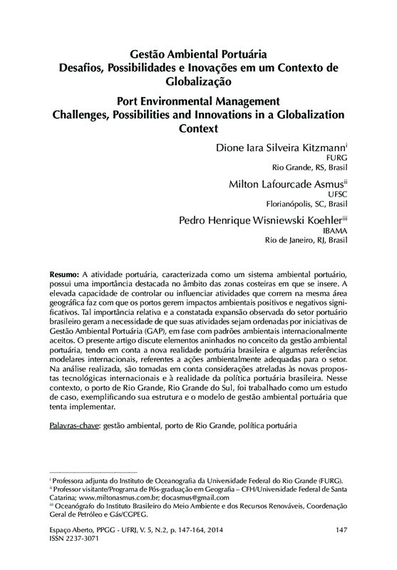 A atividade portuária, caracterizada como um sistema ambiental portuário, possui uma importância destacada no âmbito das zonas costeiras em que se insere. A elevada capacidade de controlar ou influenciar atividades que correm na mesma área geográfica faz com que os portos gerem impactos ambientais positivos e negativos significativos. Tal importância relativa e a constatada expansão observada do setor portuário brasileiro geram a necessidade de que suas atividades sejam ordenadas por iniciativas de Gestão Ambiental Portuária (GAP), em fase com padrões ambientais internacionalmente aceitos. O presente artigo discute elementos aninhados no conceito da gestão ambientalportuária, tendo em conta a nova realidade portuária brasileira e algumas referências modelares internacionais, referentes a ações ambientalmente adequadas para o setor. Na análise realizada, são tomadas em conta considerações atreladas às novas propostastecnológicas internacionais e à realidade da política portuária brasileira. Nesse contexto, o porto de Rio Grande, Rio Grande do Sul, foi trabalhado como um estudo de caso, exemplificando sua estrutura e o modelo de gestão ambiental portuária que tenta implementar.