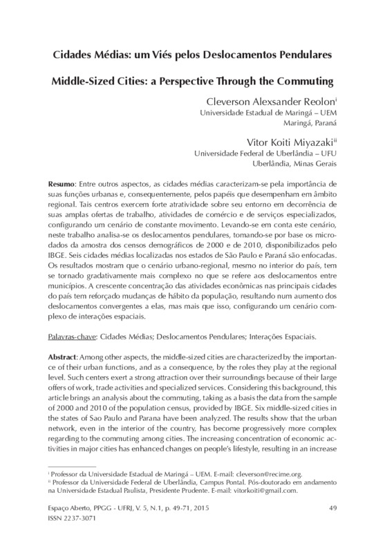 Entre outros aspectos, as cidades médias caracterizam-se pela importância de suas funções urbanas e, consequentemente, pelos papéis que desempenham em âmbito regional. Tais centros exercem forte atratividade sobre seu entorno em decorrência de suas amplas ofertas de trabalho, atividades de comércio e de serviços especializados, configurando um cenário de constante movimento. Levando-se em conta este cenário, neste trabalho analisa-se os deslocamentos pendulares, tomando-se por base os microdados da amostra dos censos demográficos de 2000 e de 2010, disponibilizados pelo IBGE. Seis cidades médias localizadas nos estados de São Paulo e Paraná são enfocadas. Os resultados mostram que o cenário urbano-regional, mesmo no interior do país, tem se tornado gradativamente mais complexo no que se refere aos deslocamentos entre municípios. A crescente concentração das atividades econômicas nas principais cidades do país tem reforçado mudanças de hábito da população, resultando num aumento dos deslocamentos convergentes a elas, mas mais que isso, configurando um cenário complexo de interações espaciais.