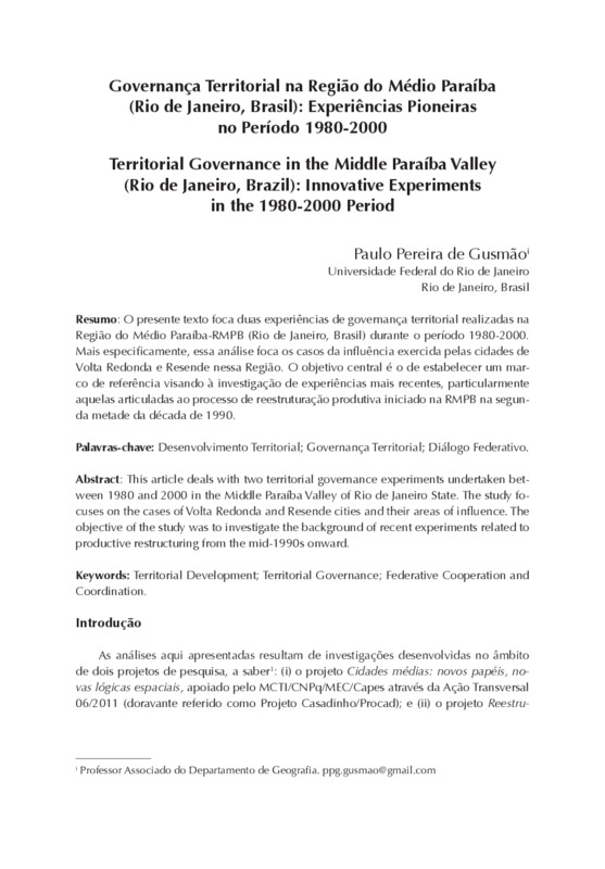 O presente texto foca duas experiências de governança territorial realizadas na Região do Médio Paraíba-RMPB (Rio de Janeiro, Brasil) durante o período 1980-2000. Mais especificamente, essa análise foca os casos da influência exercida pelas cidades de Volta Redonda e Resende nessa Região. O objetivo central é o de estabelecer um marco de referência visando à investigação de experiências mais recentes, particularmente aquelas articuladas ao processo de reestruturação produtiva iniciado na RMPB na segunda metade da década de 1990.