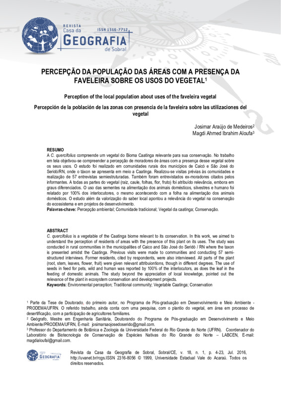 A C. quercifolius compreende um vegetal do Bioma Caatinga relevante para sua conservação. No trabalho em tela objetivou-se compreender a percepção de moradores de áreas com a presença desse vegetal sobre os seus usos. O estudo foi realizado em comunidades rurais dos municípios de Caicó e São José do Seridó/RN, onde o táxon se apresenta em meio a Caatinga. Realizou-se visitas prévias às comunidades e realização de 57 entrevistas semiestruturadas. Também foram entrevistados ex-moradores citados pelos informantes. A todas as partes do vegetal (raiz, caule, folhas, flor, fruto) foi atribuído relevância, embora em graus diferenciados. O uso das sementes na alimentação dos animais domésticos, silvestres e humano foi relatado por 100% dos interlocutores, o mesmo acontecendo com a folha na alimentação dos animais domésticos. O estudo além da valorização do saber local apontou a relevância do vegetal na conservação do ecossistema e em projetos de desenvolvimento. Palavras-chave: Percepção ambiental; Comunidade tradicional; Vegetal da caatinga; Conservação. ABSTRACT C. quercifolius is a vegetable of the Caatinga biome relevant to its conservation. In this work, we aimed to understand the perception of residents of areas with the presence of this plant on its uses. The study was conducted in rural communities in the municipalities of Caico and São José do Seridó / RN where the taxon is presented amidst the Caatinga. Previous visits were made to communities and conducting 57 semi-structured interviews. Former residents, cited by respondents, were also interviewed. All parts of the plant (root, stem, leaves, flower, fruit) were given relevant attribuiontions, though in different degrees. The use of seeds in feed for pets, wild and human was reported by 100% of the interlocutors, as does the leaf in the feeding of domestic animals. The study beyond the appreciation of local knowledge, pointed out the relevance of the plant in ecosystem conservation and development projects. Keywords: Environmental perception; Traditional community; Vegetable Caatinga; Conservation RESUMENLa C. quercifolius comprende a un vegetal del Bioma Caatinga relevante para su conservación. El trabajo en foco objetivó comprender la percepción de los residentes de las zonas con presencia de esta planta sobre sus usos. El estudio se realizó en las comunidades rurales de los municipios de Caicó y São José do Seridó / RN, donde la unidad taxonómica se presenta en medio de la Caatinga. Realizamos visitas anteriores a las comunidades y la realización de 57 entrevistas semi-estructuradas. También fueron encuestados antiguos residentes mencionados por los informantes. En todas las partes de la planta (raíz, tallo, hoja, flor, fruto) se le dio relevancia, aunque en diferentes grados. El uso de semillas en la dieta de los animales domésticos, salvajes y humanos fue reportado por 100% de los interlocutores, al igual que la hoja en la alimentación de animales domésticos. El estudio más allá de la valoración de los conocimientos locales, señaló la relevancia de la planta en la conservación del ecosistema y en proyectos de desarrollo. Palabras clave: Percepción ambiental; Comunidad tradicional; Vegetal de la caatinga; Conservación.