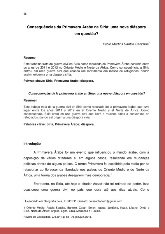 Este trabalho trata da guerra civil na Síria como resultado da Primavera Árabe, que aconteceu entre os anos de 2011 e 2012 no oriente Médio e Norte da África. Como consequência, a Síria entrou em uma guerra civil que levou a muitos sírios a se tornarem refugiados, dando assim, origem a uma diáspora síria, com a perda do território dos mesmos.