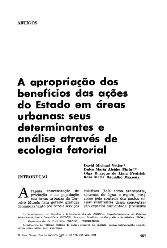 A PROPOSIÇÃO DOS BENEFÍCIOS DAS AÇÕES DO ESTADO EM ÁREAS URBANAS SEUS DETERMINANTES E ANÁLISE ATRAVÉS DA ECOLOGIA FATORIAL