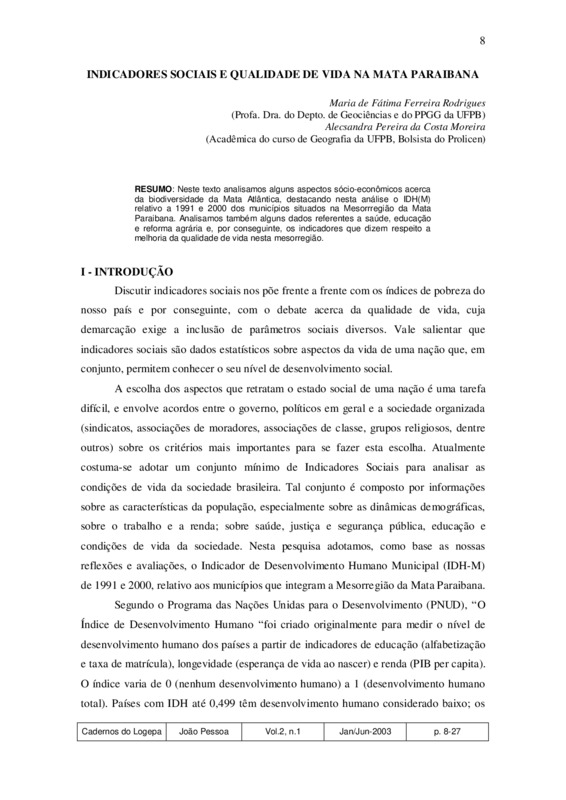 INDICADORES SOCIAIS E QUALIDADE DE VIDA NA MATA PARAIBANA