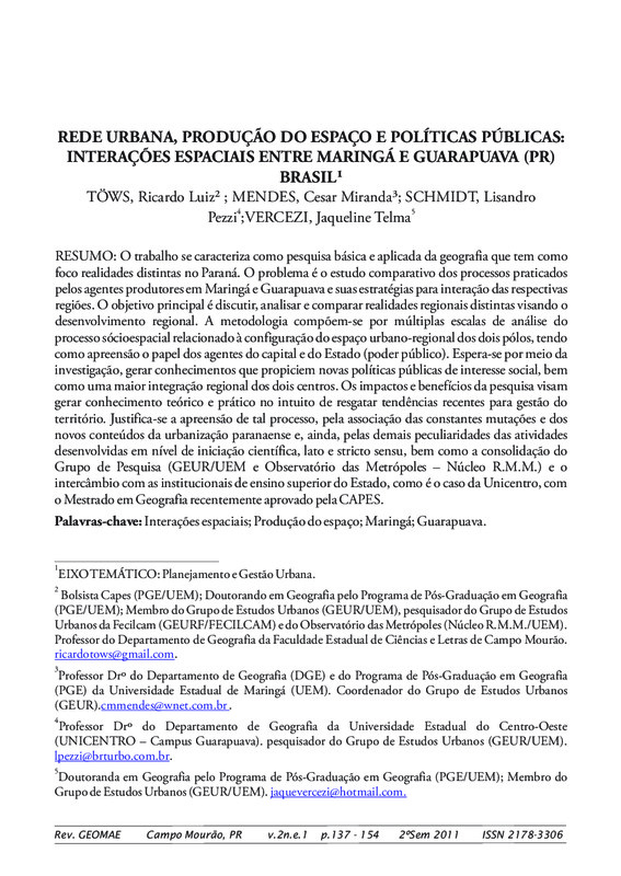 O trabalho se caracteriza como pesquisa básica e aplicada da geografia que tem como foco realidades distintas no Paraná. O problema é o estudo comparativo dos processos praticados pelos agentes produtores em Maringá e Guarapuava e suas estratégias para interação das respectivas regiões. O objetivo principal é discutir, analisar e comparar realidades regionais distintas visando o desenvolvimento regional. A metodologia compõem-se por múltiplas escalas de análise do processo sócioespacial relacionado à configuração do espaço urbano-regional dos dois pólos, tendo como apreensão o papel dos agentes do capital e do Estado (poder público). Espera-se por meio da investigação, gerar conhecimentos que propiciem novas políticas públicas de interesse social, bem como uma maior integração regional dos dois centros. Os impactos e benefícios da pesquisa visam gerar conhecimento teórico e prático no intuito de resgatar tendências recentes para gestão do território. Justifica-se a apreensão de tal processo, pela associação das constantes mutações e dos novos conteúdos da urbanização paranaense e, ainda, pelas demais peculiaridades das atividades desenvolvidas em nível de iniciação científica, lato e stricto sensu, bem como a consolidação do Grupo de Pesquisa (GEUR/UEM e Observatório das Metrópoles – Núcleo R.M.M.) e o intercâmbio com as institucionais de ensino superior do Estado, como é o caso da Unicentro, com o Mestrado em Geografia recentemente aprovado pela CAPES.