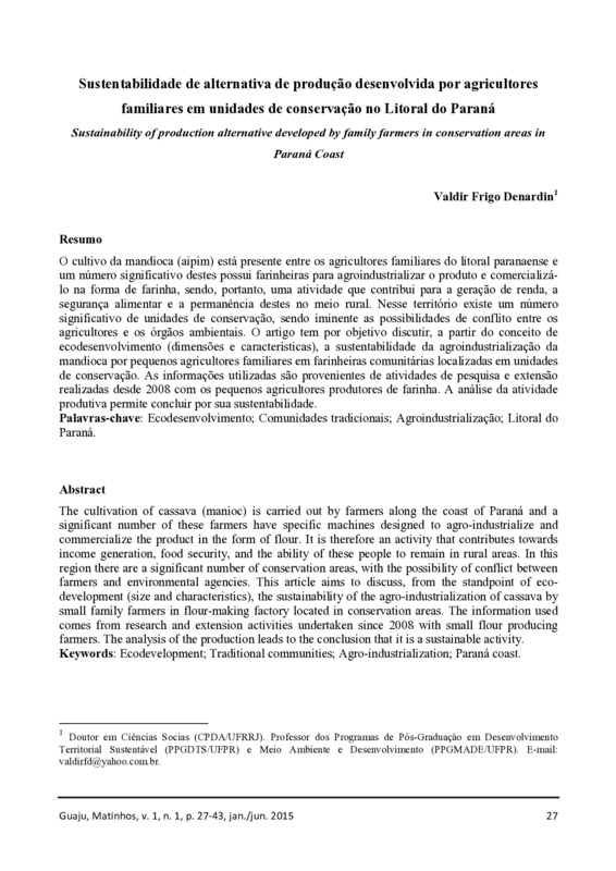 O cultivo da mandioca (aipim) está presente entre os agricultores familiares do litoral paranaense e um número significativo destes possui farinheiras para agroindustrializar o produto e comercializá- lo na forma de farinha, sendo, portanto, uma atividade que contribui para a geração de renda, a segurança alimentar e a permanência destes no meio rural. Nesse território existe um número significativo de unidades de conservação, sendo iminente as possibilidades de conflito entre os agricultores e os órgãos ambientais. O artigo tem por objetivo discutir, a partir do conceito de ecodesenvolvimento (dimensões e características), a sustentabilidade da agroindustrialização da mandioca por pequenos agricultores familiares em farinheiras comunitárias localizadas em unidades de conservação. As informações utilizadas são provenientes de atividades de pesquisa e extensão realizadas desde 2008 com os pequenos agricultores produtores de farinha. A análise da atividade produtiva permite concluir por sua sustentabilidade.