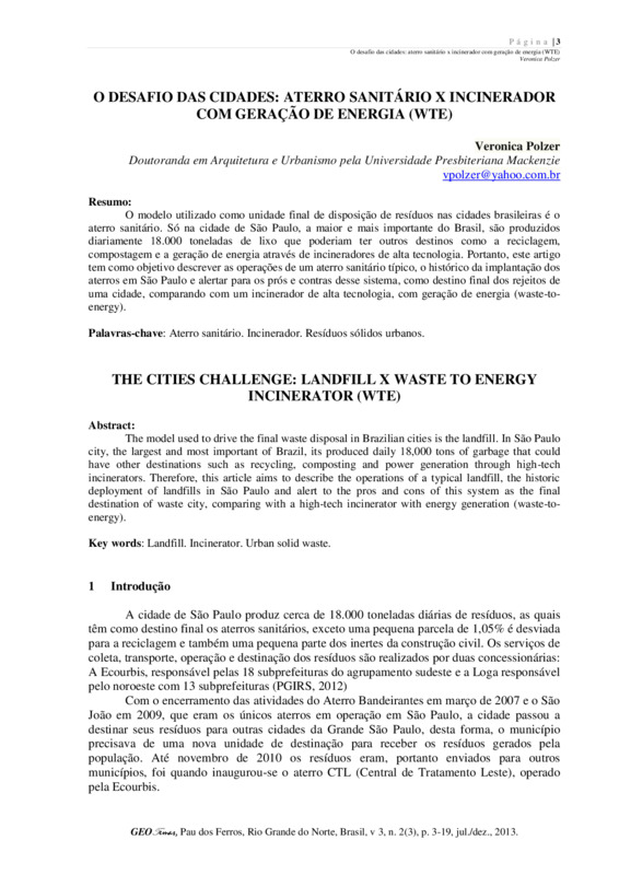 O modelo utilizado como unidade final de disposição de resíduos nas cidades brasileiras é o aterro sanitário, só na cidade de São Paulo, a maior e mais importante do Brasil, são produzidos diariamente 18.000 toneladas de lixo que poderiam ter outros destinos como a reciclagem, compostagem e a geração de energia através de incineradores de alta tecnologia, portanto este artigo tem como objetivo descrever as operações de um aterro sanitário típico, o histórico da implantação dos aterros em São Paulo e alertar para os prós e contras desse sistema como destino final dos rejeitos de uma cidade comparando com um incinerador de alta tecnologia com geração de energia (waste-to-energy).
