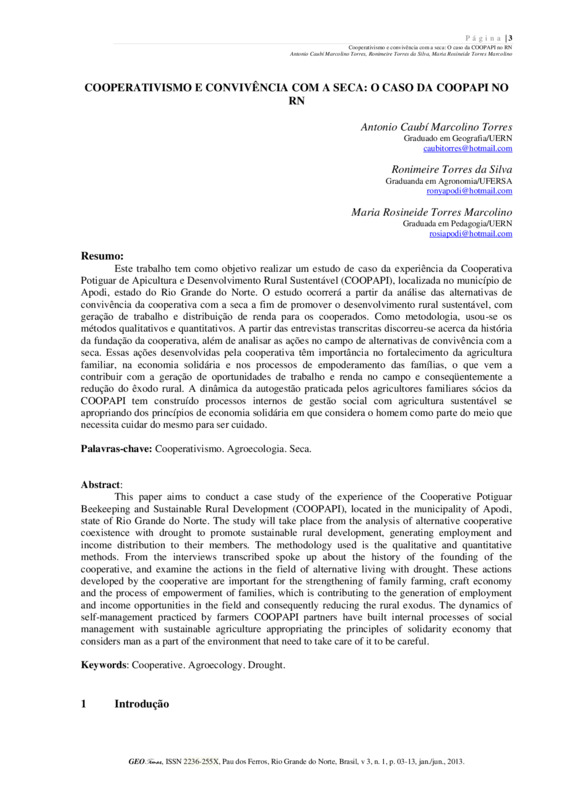 Este trabalho tem como objetivo realizar um estudo de caso da experiência da Cooperativa Potiguar de Apicultura e Desenvolvimento Rural Sustentável (COOPAPI), localizada no município de Apodi, estado do Rio Grande do Norte. O estudo ocorrerá a partir da análise das alternativas de convivência da cooperativa com a seca a fim de promover o desenvolvimento rural sustentável, com geração de trabalho e distribuição de renda para os cooperados. Como metodologia, usou-se os métodos qualitativos e quantitativos. A partir das entrevistas transcritas discorreu-se acerca da história da fundação da cooperativa, além de analisar as ações no campo de alternativas de convivência com a seca. Essas ações desenvolvidas pela cooperativa têm importância no fortalecimento da agricultura familiar, na economia solidária e nos processos de empoderamento das famílias, o que vem a contribuir com a geração de oportunidades de trabalho e renda no campo e conseqüentemente a redução do êxodo rural. A dinâmica da autogestão praticada pelos agricultores familiares sócios da COOPAPI tem construído processos internos de gestão social com agricultura sustentável se apropriando dos princípios de economia solidária em que considera o homem como parte do meio que necessita cuidar do mesmo para ser cuidado.
