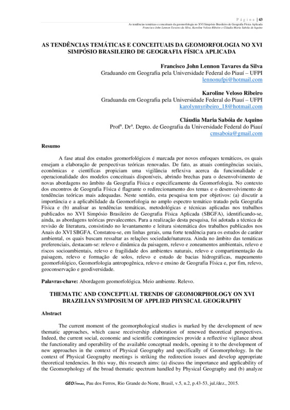 A fase atual dos estudos geomorfológicos é marcada por novos enfoques temáticos, os quais ensejam a elaboração de perspectivas teóricas renovadas. De fato, as atuais contingências sociais, econômicas e científicas propiciam uma vigilância reflexiva acerca da funcionalidade e operacionalidade dos modelos conceituais disponíveis, abrindo brechas para o desenvolvimento de novas abordagens no âmbito da Geografia Física e especificamente da Geomorfologia. No contexto dos encontros de Geografia Física é flagrante o redirecionamento dos temas e o desenvolvimento de tendências teóricas mais adequadas. Neste sentido, esta pesquisa tem por objetivos: (a) discutir a importância e a aplicabilidade da Geomorfologia no amplo espectro temático tratado pela Geografia Física e (b) analisar as tendências temáticas, metodológicas e técnicas aplicadas nos trabalhos publicados no XVI Simpósio Brasileiro de Geografia Física Aplicada (SBGFA), identificando-se, ainda, as abordagens teóricas prevalecentes. Para a realização desta pesquisa, foi adotada a técnica de revisão de literatura, consistindo no levantamento e leitura sistemática dos trabalhos publicados nos Anais do XVI SBGFA. Constatou-se, em linhas gerais, uma forte tendência para os estudos de caráter ambiental, os quais buscam ressaltar as relações sociedade/natureza. Ainda no âmbito das temáticas preferenciais, destacam-se: relevo e dinâmica da paisagem, relevo e zoneamentos ambientais, relevo e riscos socioambientais, relevo e fragilidade dos ambientes naturais, relevo e compartimentação da paisagem, relevo e formação de solos, relevo e estudo de bacias hidrográficas, mapeamento geomorfológico, Geomorfologia antropogênica, relevo e ensino de Geografia Física e, por fim, relevo, geoconservação e geodiversidade.