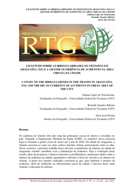 Os acidentes de trânsito têm sido uma das principais causas de mortes e invalidez no país. Segundo a Organização Mundial da Saúde (OMS), os acidentes dessa natureza logo se tornarão a 5ª causa de morte até o ano de 2030. Na cidade de Araguaína, o trânsito encontra-se cada vez mais caótico fazendo vitimas praticamente todos os dias. Nesse contexto, o presente trabalho busca discutir os problemas do trânsito na cidade de Araguaína (TO) visando contribuir com a diminuição de acidentes. Para a realização deste estudo, além de pesquisas e leituras referentes à problemática, analisamos dados sobre o número de acidentes na cidade, quantitativo referente à frota de veículos e ao número de vitimas. A partir dos estudos realizados constatou-se que, para diminuir o número de acidentes, além de melhorias na infraestrutura geral da cidade, é preciso haver mais respeito e educação no trânsito.