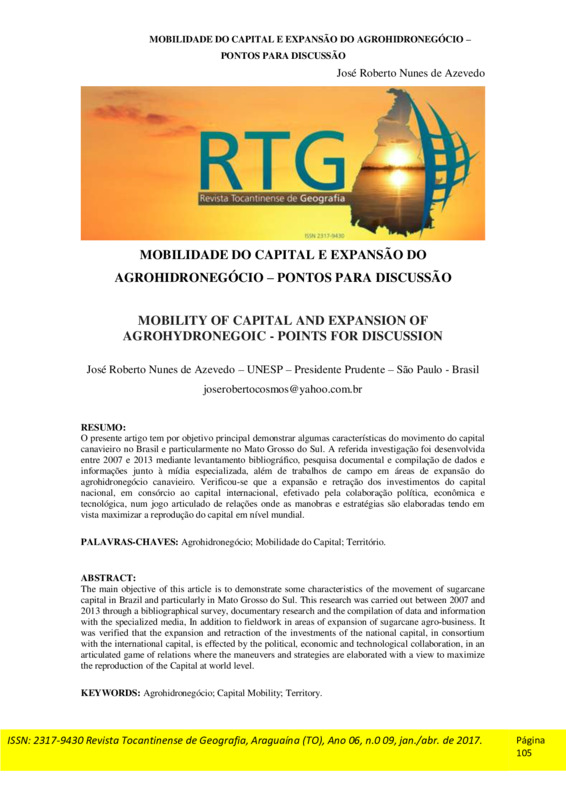MOBILIDADE DO CAPITAL E EXPANSÃO DO AGROHIDRONEGÓCIO – PONTOS PARA DISCUSSÃO