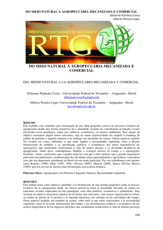 Este trabalho visa contribuir para formulação de um olhar geográfico acerca do processo evolutivo da agropecuária desde suas formas primitivas até a atualidade, levando em consideração as relações sociais envolvidas nesse paradigma, sejam elas políticas, econômicas, ou mesmo ambientais. Para atingir tal objetivo ensaiamos alguns temas relevantes, cujo de maior expressividade diz respeito à mudança de padrão da primeira à segunda natureza com enfoque nas atividades do campo; outros aspectos também são levados em conta, sobretudos os que estão ligados à racionalidade capitalista, como a divisão internacional do trabalho e as articulações políticas e econômicas dos atores hegemônicos do agronegócio, que atualmente condicionam a vida de muitas pessoas e as atividades produtivas da agropecuária; além disso, contemplamos também a evolução técnica no campo e o agronegócio brasileiro. Assim, verificamos que o quadro atual faz com que a elite ruralista seja a grande responsável pela total mercantilização e modernização das atividades rurais (principalmente a agricultura e a pecuária) com que nos deparamos atualmente no Brasil de um modo particular. Por isso trabalhamos com autores como Kautsky (1980), Marx (1983; 1984), Oliveira (2007), Mazzali (2000), Santos (2014a), Harvey (2005), que nos servem de alicerce para formulações acerca dessa temática.